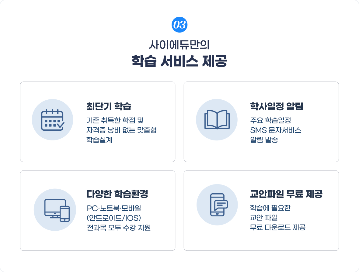 2024년 2학기 성적우수 장학생학업과 일을 병행해야 하는 직장인, 편입이나 대학원 등 진학을 준비하며 학점을 전략적으로 채우고자 하는 분들께 학점은행제는 매우 효과적인 선택이며 본인의 시간과 계획을 유연하게 활용할 수 있다는 점에서 많은 분들께 추천하고 싶습니다. 특히 사이에듀는 수강, 과제, 시험 일정을 문자, 이메일, 쪽지 등 다양한 방..